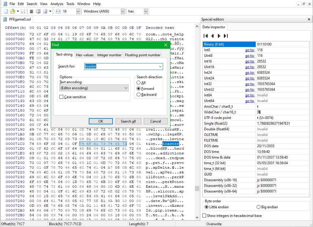 Откройте файл сохранения в любом шестнадцатеричном редакторе. Лучше использовать упомянутый выше редактор HxD. Выберите File > Open... на панели инструментов и перейдите к поврежденному файлу сохранения (.sol или .sav), у которого должна быть резервная копия. Вы увидите содержимое файла, интерпретируемое как байты, с предварительным просмотром кодировки ANSI справа.