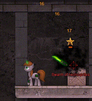 Swarm of necrosprites is an enemy found in Canterlot ruins, being arguably the most dangerous enemy found there. It takes the appearance of a black cloud, which is known to be made up of tiny bloatsprites, full of necromancy. It can pass through walls and doors and is completely immune to most physical attacks.